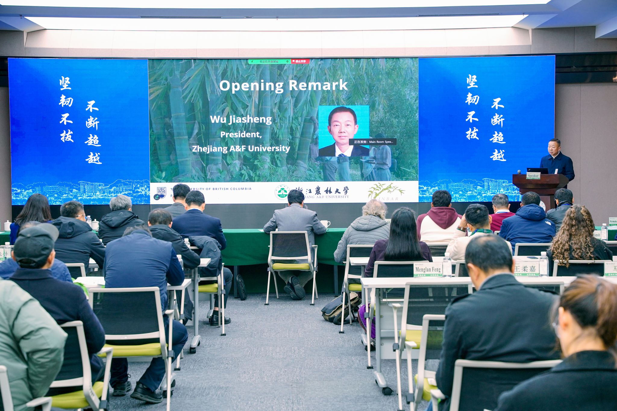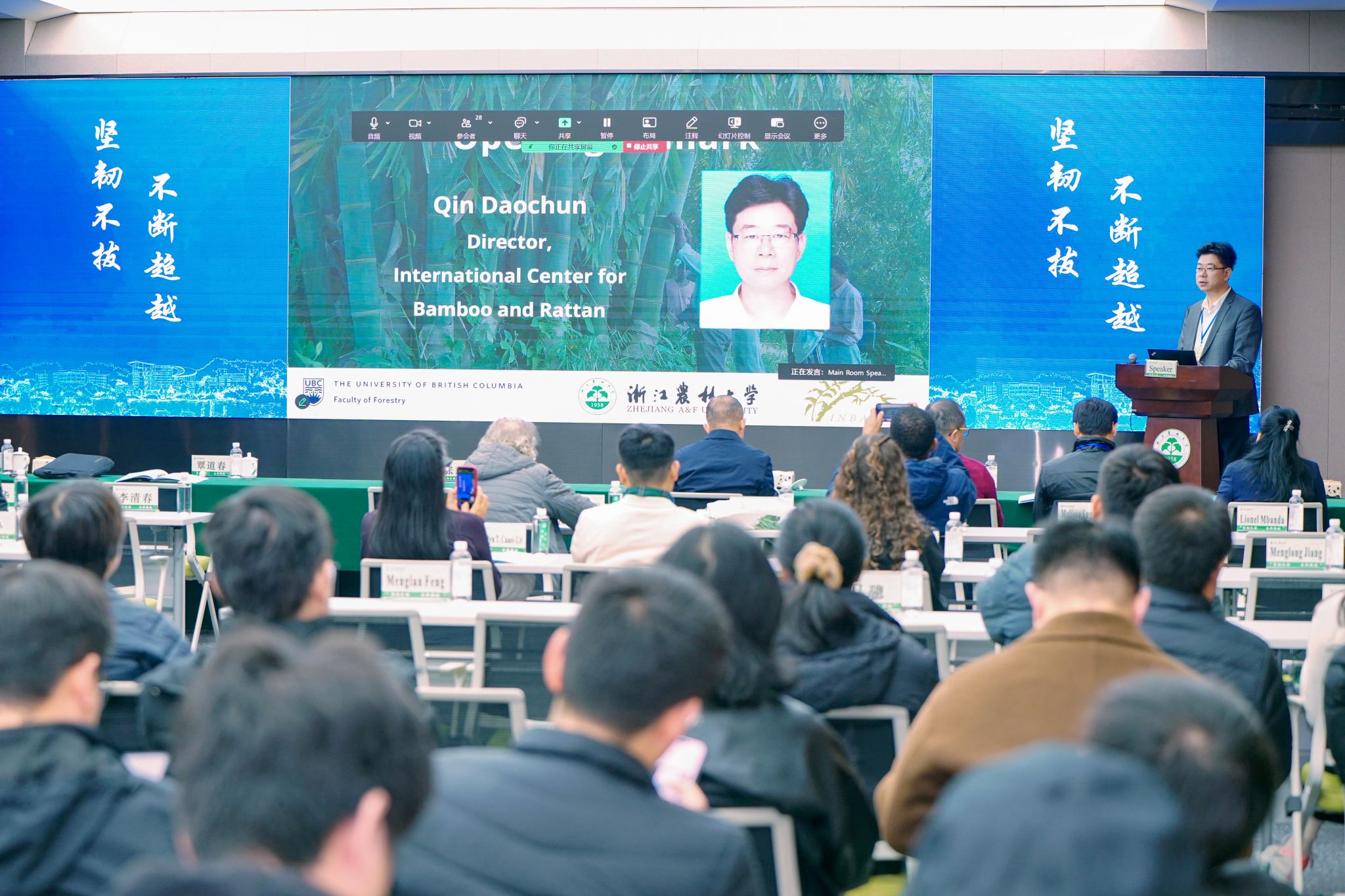 国际竹藤组织副总干事张东升、国际竹藤中心主任覃道春、浙江农林大学校长吴家胜、加拿大不列颠哥伦比亚大学林学院院长Rob Kozak教授出席开幕式并致辞。来自国内外43家高校、科研机构和产业协会的二百多名专家、青年教师和研究生线下参加了开幕式。开幕式由瑞典皇家科学院院士John Innes教授主持。