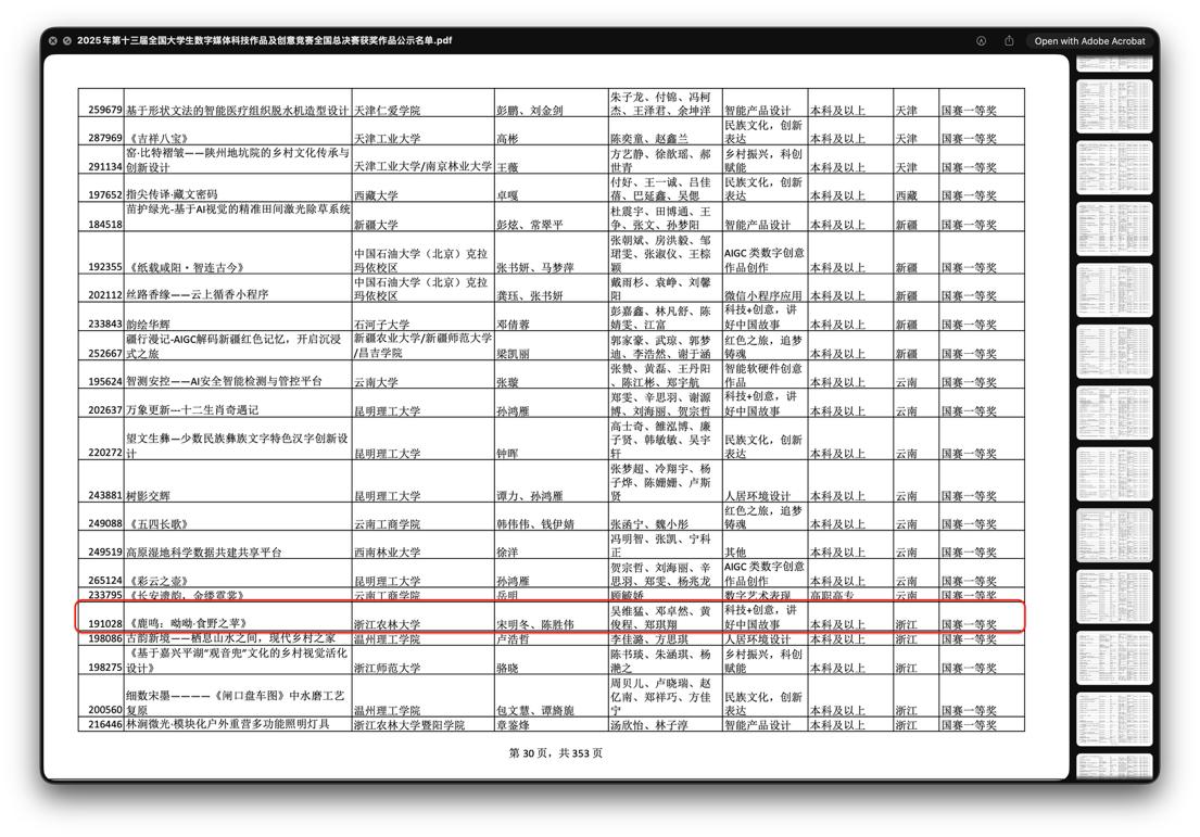 10月27日,2025年第十三届全国大学生数字媒体科技作品及创意竞赛全国总决赛在哈尔滨举行。全国大学生数字媒体科技作品及创意竞赛是本科生一类学科竞赛,浙江省共有15支队伍获得各国赛一等奖。