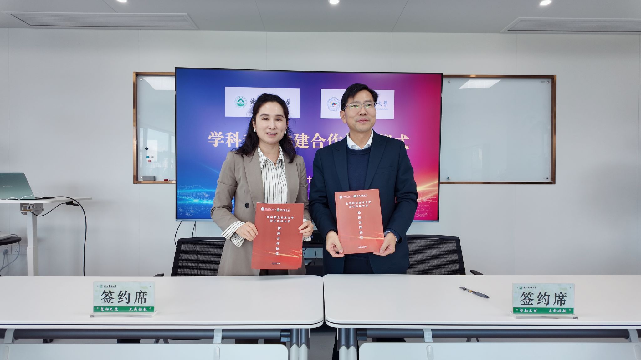11月13日下午,浙江农林大学动物科技学院·动物医学院与金华职业技术大学在东湖校区举行学科专业共建合作签约仪式。金华职业技术大学副校长陈夙一行,浙江农林大学党委委员、动科动医学院院长宋厚辉,研究生院院长宋丽丽等出席签约仪式。