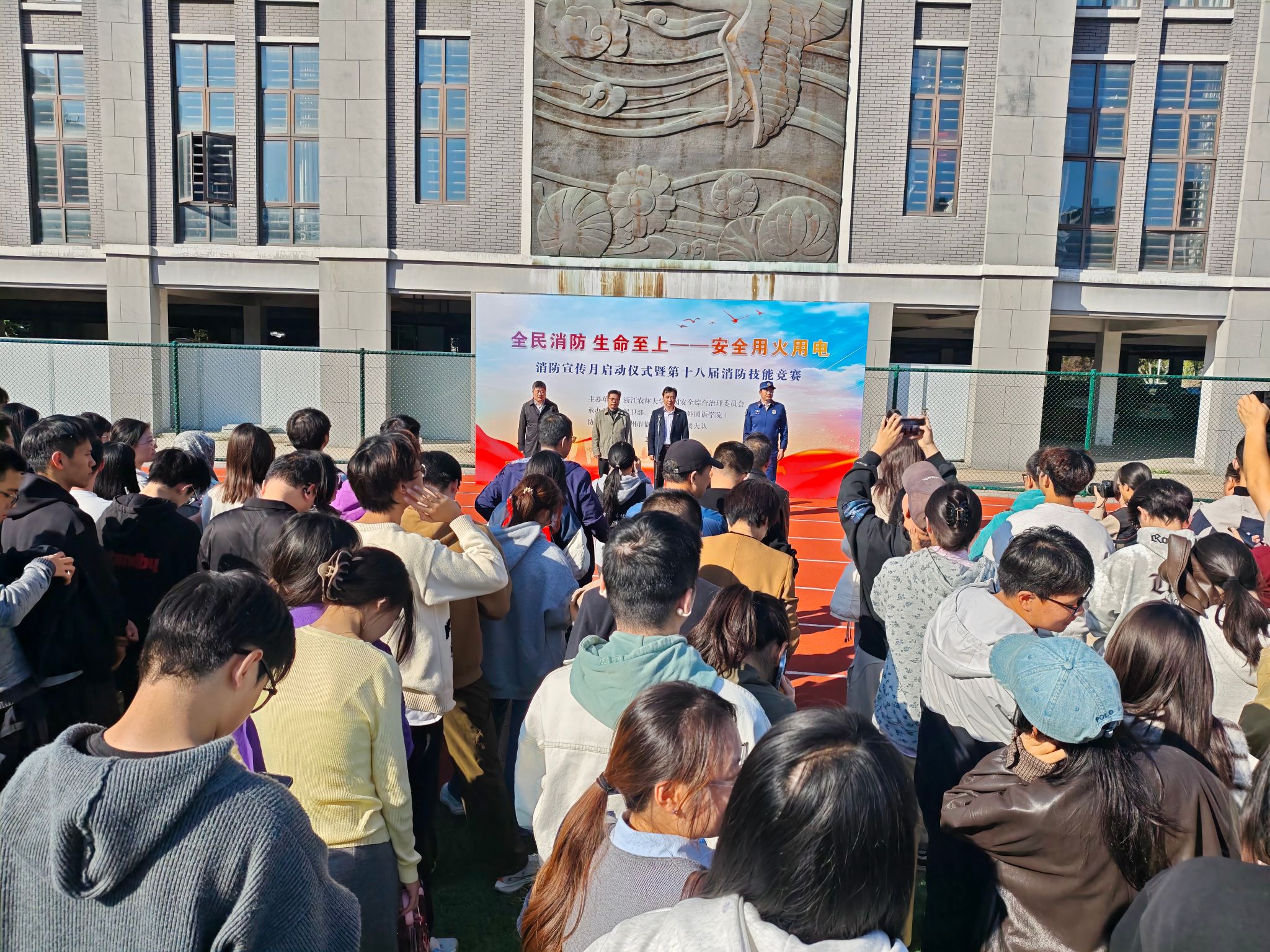 11月13日下午,消防宣传月启动仪式暨第十八届消防技能竞赛在衣锦校区田径场拉开帷幕,本次宣传月活动的主题是“全民消防、生命至上-安全用火用电”,校党委副书记倪建均、临安区消防救援大队参谋张恒、校保卫部部长吴青林、文法学院副书记(主持工作)徐达出席启动仪式,启动仪式由文法学院相关负责人主持。来自全校20支参赛队伍、师生员工代表500余人参加。