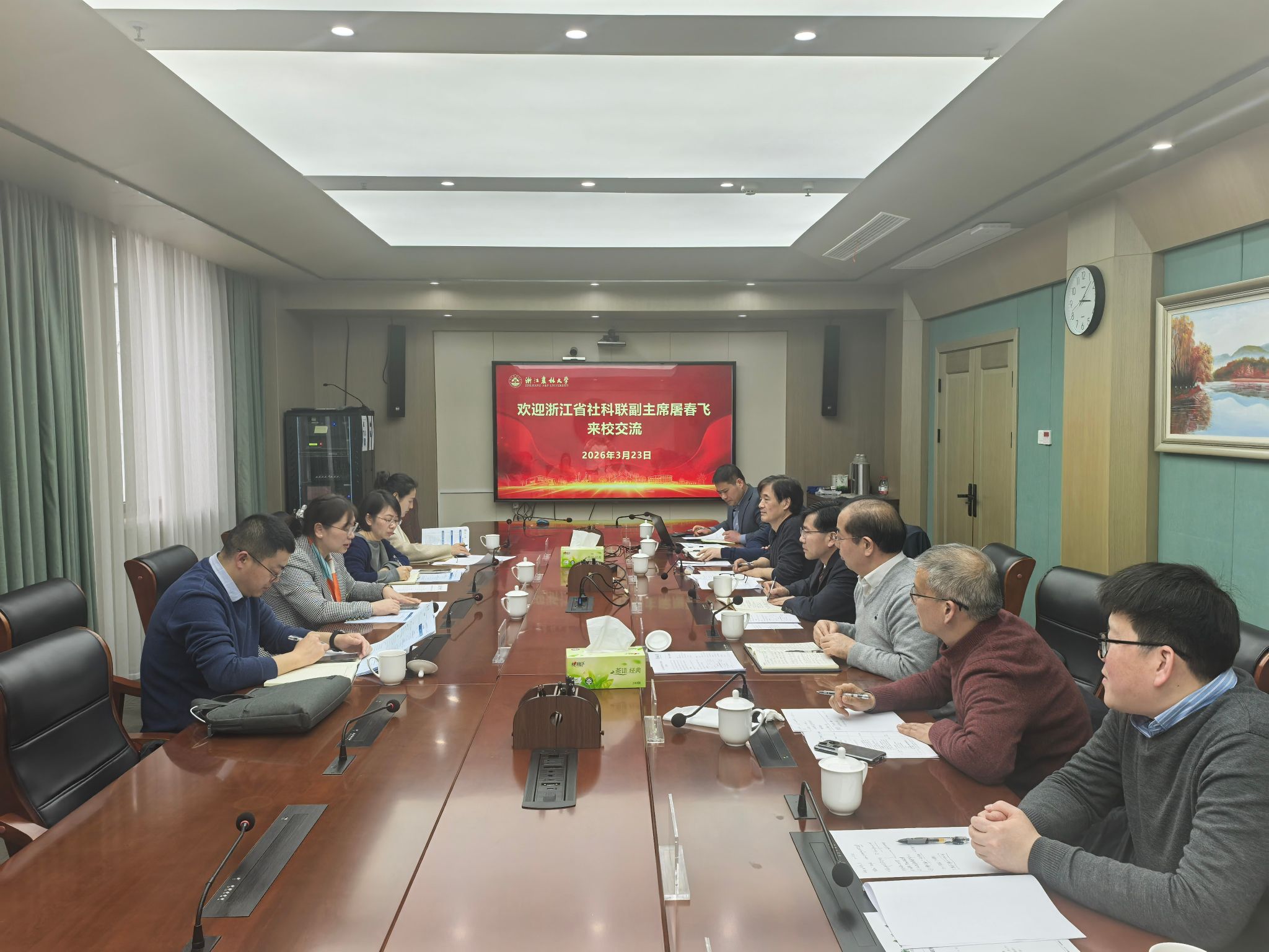 宋厚辉对屠春飞一行的到来表示热烈欢迎,对省社科联长期以来给予我校哲学社会科学事业发展的关心、支持与指导表示衷心感谢。他介绍了学校哲学社会科学学科布局、智库建设基础及发展规划,并表示学校将全力做好2026年省级新型智库年度工作交流会承办工作,确保会议顺利举办、取得实效。