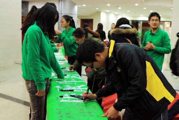 场内气氛热烈,场外依旧火爆。我校12名环保部“千名青年环境友好使者”专门设置了“传承生态行为,共建美丽家园”的绿色生态签名横幅,用“低碳罗盘”向到场的师生现场讲解“碳足迹计量方法”和生态行为的有关知识。这是对党的十八大生态愿景的积极响应,也是我校青年大学生承担生态文明建设责任的呈现。