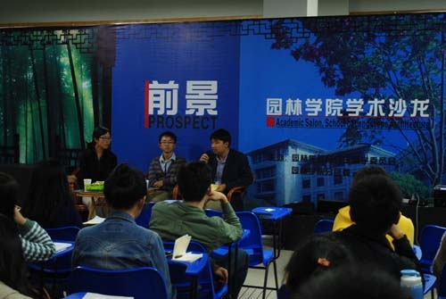 三位80后年轻老师与在座研究生分享了自己的求学经历和专业学习经验。洪泉老师通过自己的学习、生活给园林设计专业的研究生提出两点建议:一是多去体验人生;二是设计是相通的,可在建筑、平面设计、产品设计等领域汲取灵感;唐慧超老师以自己独特的经历分享了读研的收获,分别是学好英语、拔掉网线多读点书、学会自控、出去看看、培养品位、了解自我等,她生动真挚的话语引起了在场同学的深深共鸣;鲍沁星老师强调要向身边优秀的同学学习,积极参加各类活动,学会与他人交流、分享,处理好与同学、室友和老师之间的关系。他以自身实例来讲述交流、沟通的重要性,幽默的话语让现场的气氛达到高潮。