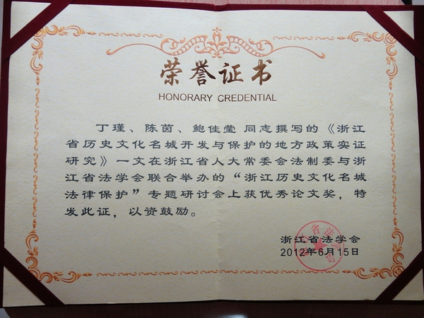 会议由牛太升主持,胡虎林、任亦秋发表讲话,陈柳裕做会议总结。浙江大学城市学院法学院侯作前教授、杭州师范大学法学院范忠信教授作了主题发言,其他与会专家学者分别进行了交流发言。我校法政学院法律系教师马永双提交了《修改〈浙江省历史文化名城保护条例〉的11点建议》,并在会上发言;法学专业2008级的丁瑾、陈茵、鲍佳莹三位同学在学校大学生创新课题研究成果的基础上撰写了《浙江省历史文化名城开发与保护的地方政策实证研究》一文,提交了此次研讨会,并应邀参会交流,获得了优秀论文奖。法政学院师生提交的论文和会上发言引起与会专家的关注和好评,希望学院法学专业的师生今后进一步关注浙江的地方立法,多提建议。