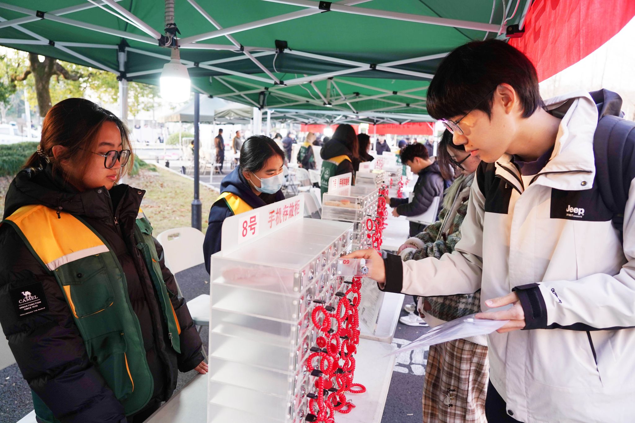 浙江农林大学考点,考生将手机寄存在考场外的手机存放柜。