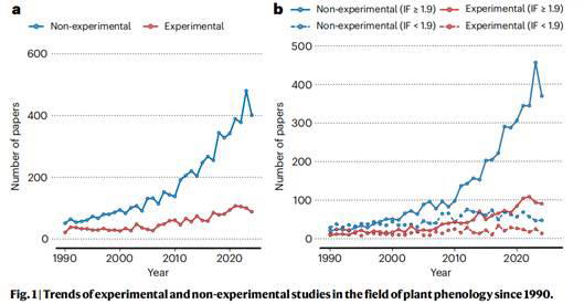 该研究以团队长期关注的树木物候学为切入点展开系统分析。研究团队基于关键词检索,系统梳理了1990年以来Web of Science核心合集收录的810种期刊中的8606篇植物物候研究论文,并借助人工智能辅助分类模型,将其划分为涵盖对温度、光周期、干旱等环境因子主动操控的“实验研究”和观测数据分析、遥感、理论模型等“非实验研究”。分析结果显示,近30多年来,树木物候领域发文量呈指数级增长,但增量主要来自非实验研究,而操控实验的增长则较为缓慢。
