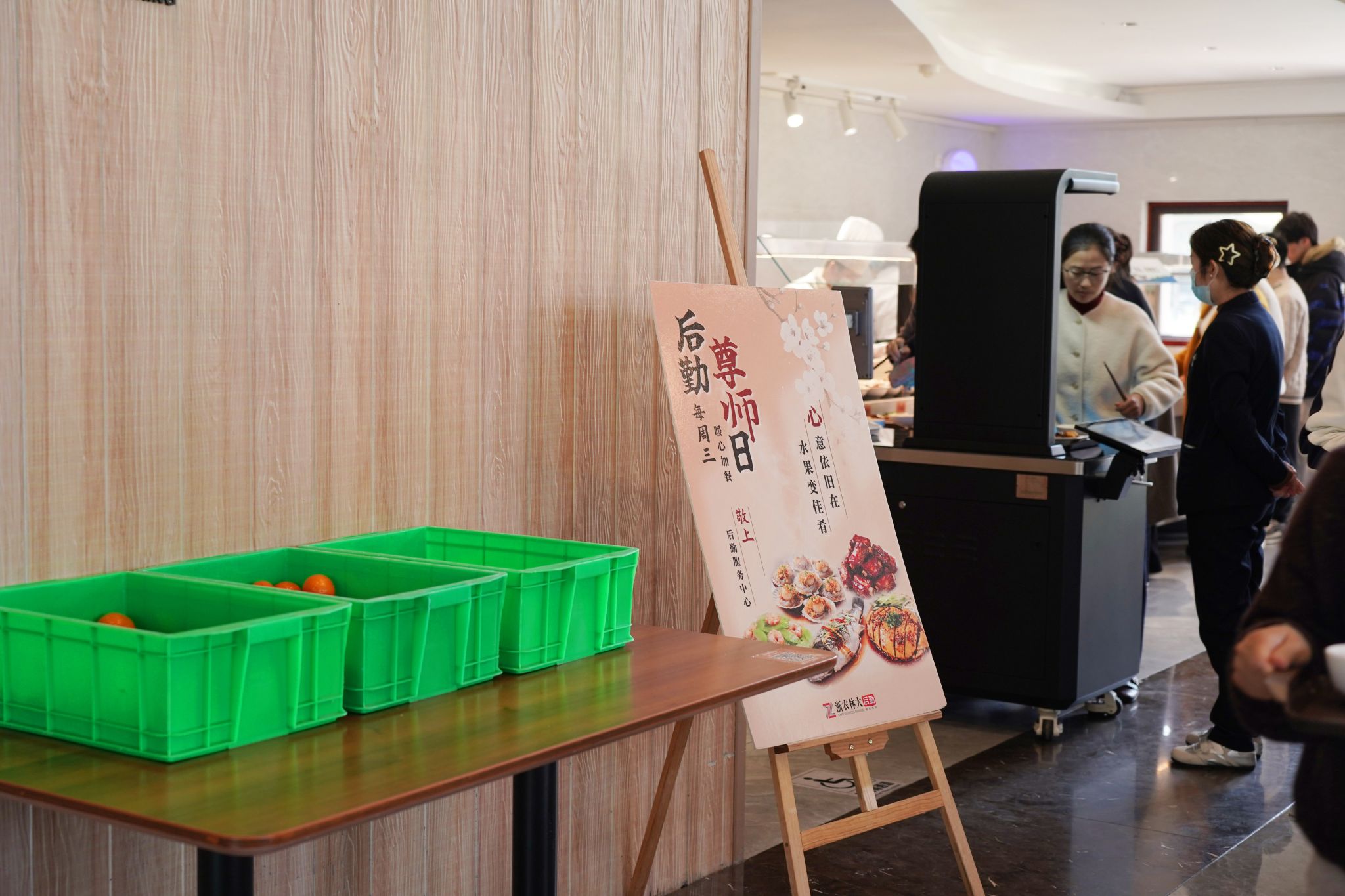 “我们举办‘后勤尊师日’,其核心目的是将后勤从传统的服务保障角色,升级为育人阵地和情感纽带,提升学生尊师意识和教职工的获得感与幸福感。”浙农林大后勤中心主任陈审声介绍,在校友的捐赠下,免费赠送水果的活动固定在每周三午餐时段,在东湖教工餐厅、衣锦教工餐厅、银杏餐厅、暨阳学院教工餐厅同步开展,每一位前来就餐的教职工都能免费领到一份水果,让尊师重教的暖意融入日常餐饮服务中。