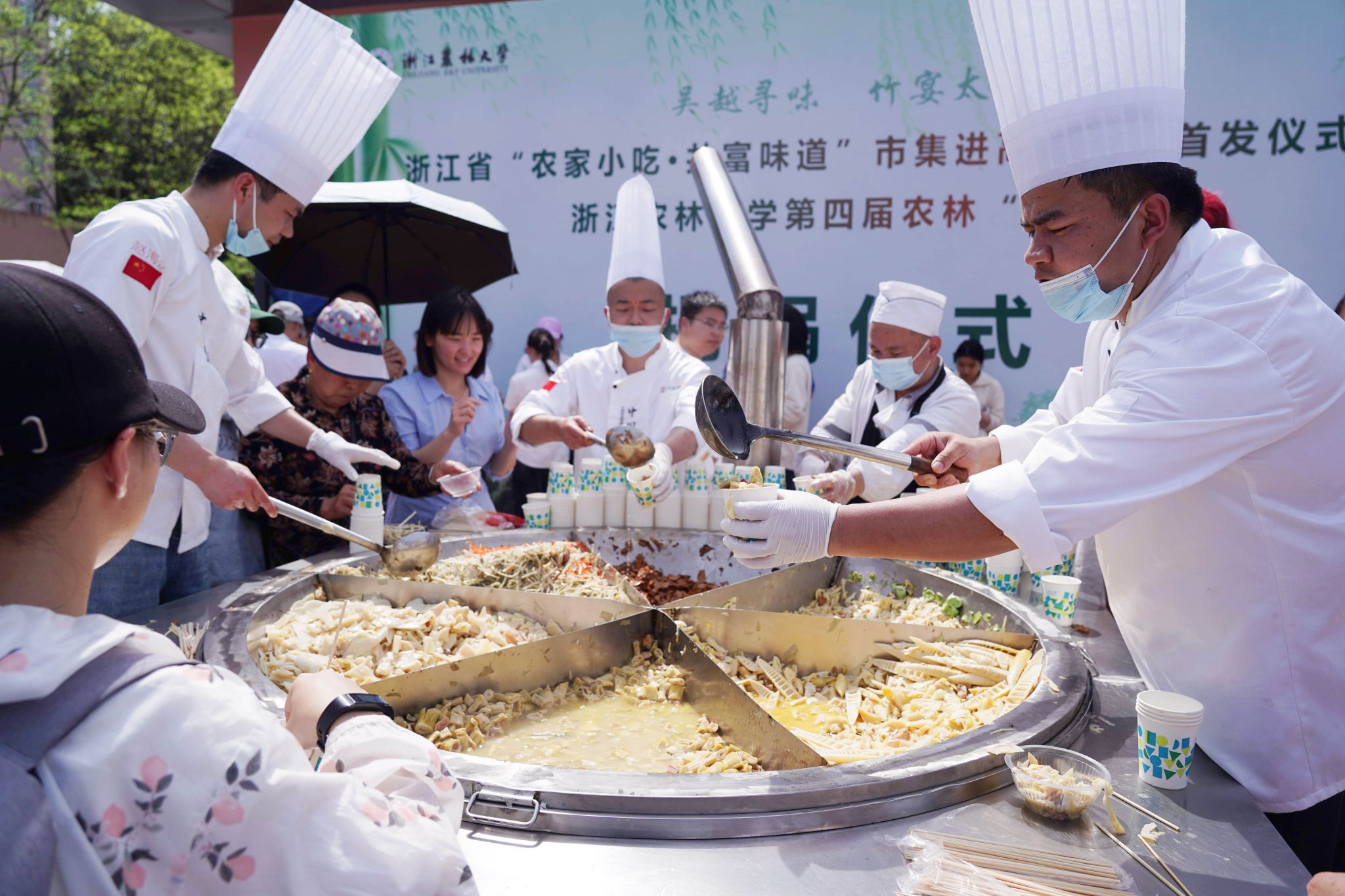 当天,由浙江农林大学、杭州市临安区政府、浙江省农家小吃协会等共同主办的浙江省“农家小吃・共富味道”市集进高校活动首发仪式暨浙江农林大学第四届“笋”宴开幕式在这里举行。这是该校第四次举办笋宴,也是首次与“农家小吃·共富味道”市集深度融合。