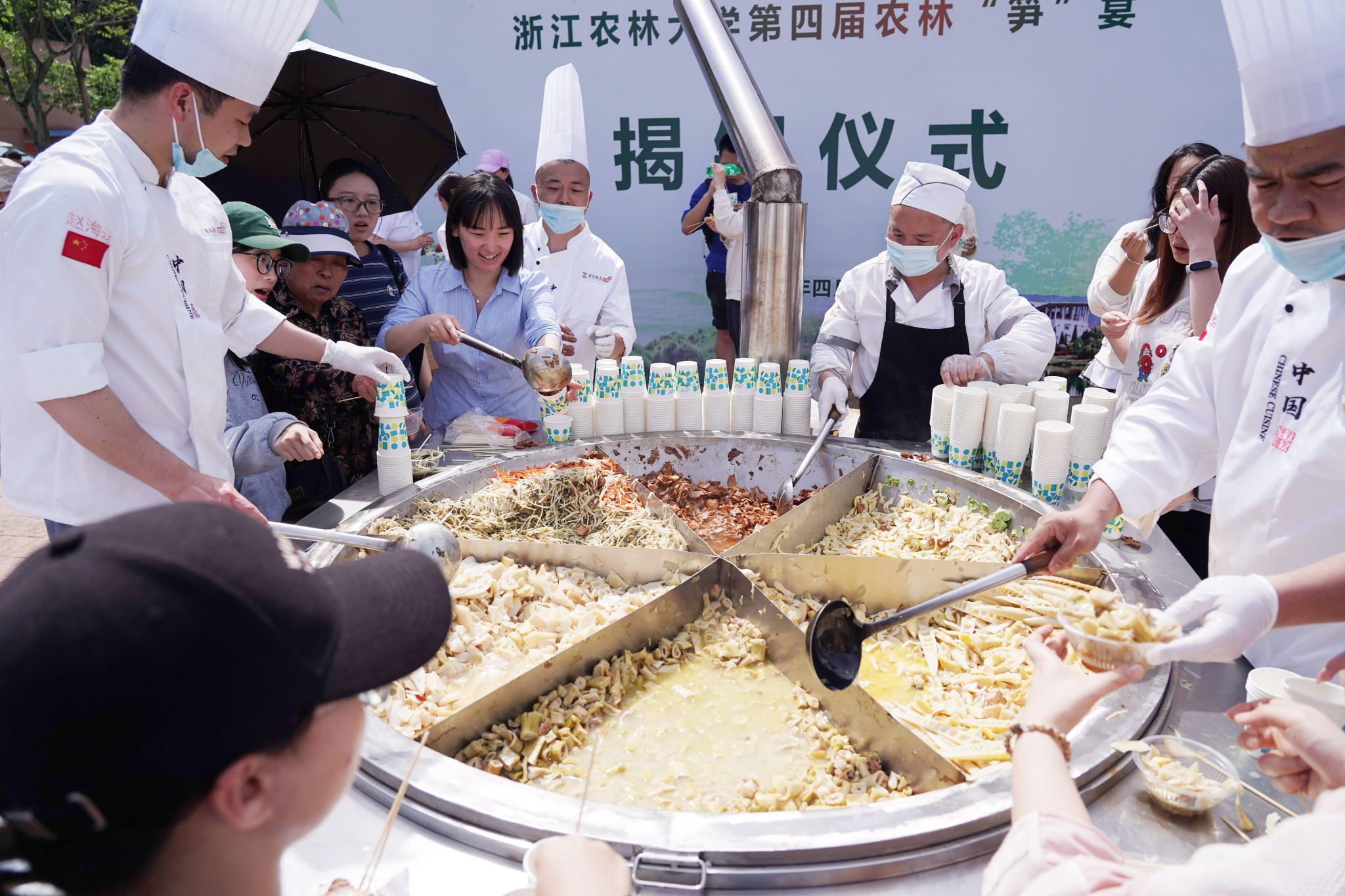 最受期待的是“揭锅仪式。一口直径1.5米的“吴越六鼎太平锅”缓缓揭开木盖,6道江南特色笋菜鲜香扑鼻。这些菜品均由该校竹子研究院改良培育的冬笋、春笋、雷笋、毛笋,搭配笋干、笋尖及临安原生态鲜笋,由学校食堂厨师团队现场烹制,涵盖春笋煨土鸡、笋干炖仔排等风味,供师生免费畅吃。