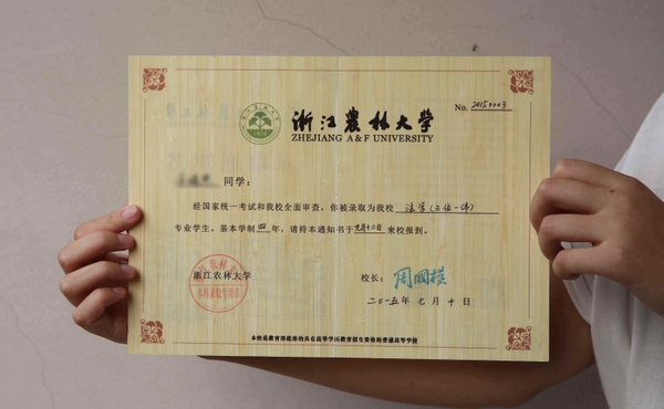 2015年7月15日,从浙江农林大学招生办获悉,今年被浙江农林大学录取的2015级本科新生,即将收到一份珍贵的礼物:全球独一无二,以毛竹为原材料、用刨切微薄竹技术制作并印刷而成的录取通知书。