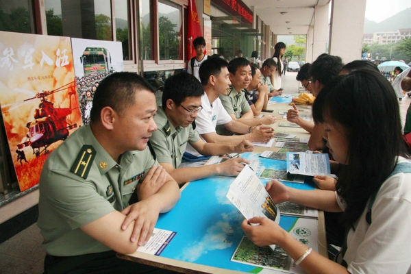 6月3日,浙江农林大学举行在校大学生参军入伍咨询活动,地方武装部门专门设立政策咨询台为大学生解难释疑,不仅吸引了男生积极参与咨询和报名,一些女生也前来咨询参军入伍的身体条件、相关政策。近年来,浙江农林大学十分重视大学生参军入伍工作,并在学籍保留、学分替换、学费减免等方面出台一系列政策,鼓励大学生积极投身军营。据不完全统计,去年该校就有近60名在校大学生参军入伍。