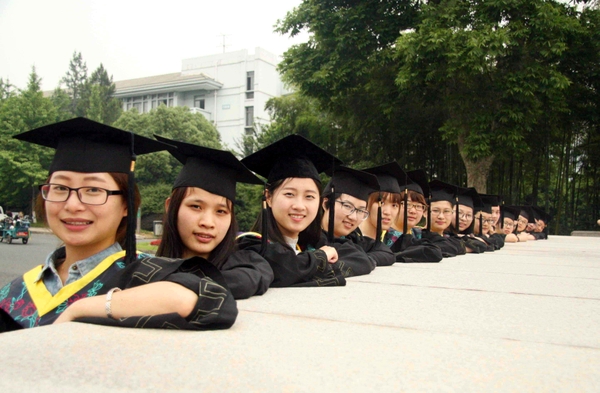 日前,浙江农林大学的应届毕业生身穿学士服,在校门口拍摄各种纪念照片庆祝毕业。