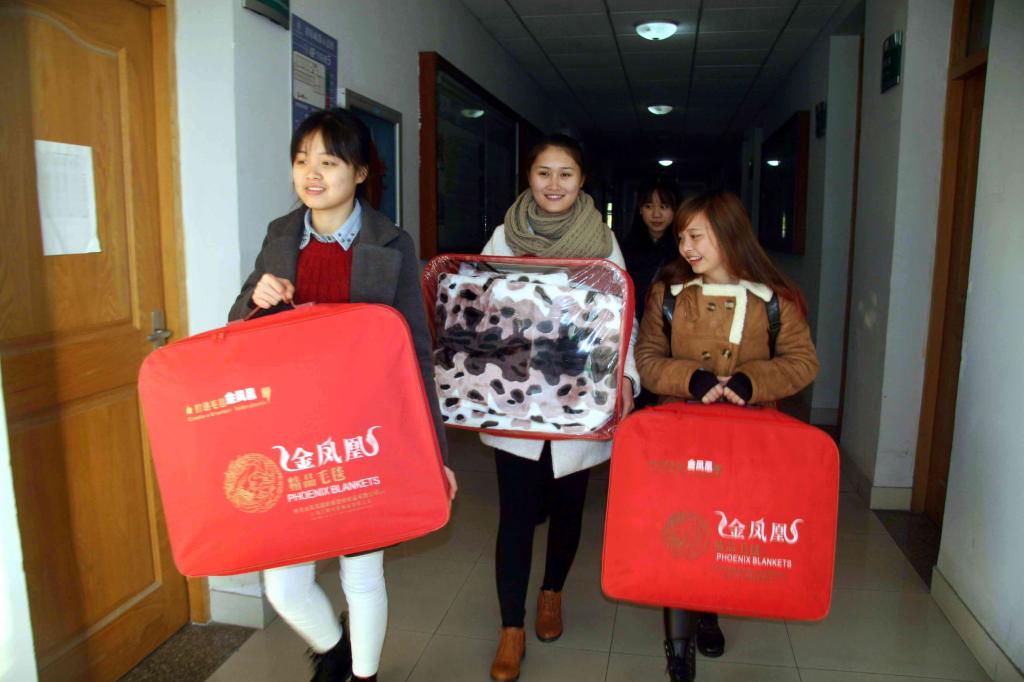 12月4日,浙江农林大学文化学院的40多名贫困学生,开心地从老师手里领到了学校发放的被子等保暖物品。浙江农林大学所在的浙江省临安市12月3日下了今冬第一场雪,为帮助贫困生抵御严寒、安心学习,浙江农林大学各个学院纷纷开展送温暖活动,为贫困学生送上保暖用品,让他们无论是身上还是心中,都能感受到学校的温暖。