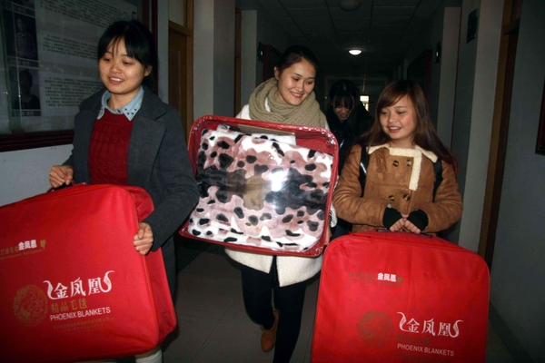 12月4日,浙江农林大学文化学院的40多名贫困学生,开心地从老师手里领到了学校发放的被子等保暖物品。