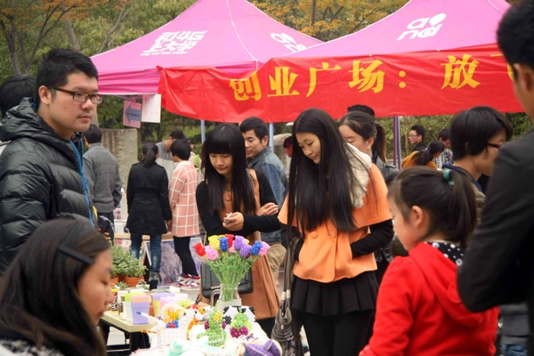 浙江农林大学的学生近日在校园创业广场交易各种学习用品、植物盆景以及手工制作的工艺品,积累创业经验、体验创业乐趣。据悉,浙江农林大学校园创业广场成立于2008年,坚持利用周末在校园举办交易活动,已经有数千名学生通过参与校园创业广场活动,感受创业过程中的艰辛与快乐。