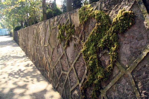 这几天,浙江农林大学运动场边上的墙壁上,出现了一组以苔藓为“颜料”的特殊墙绘作品,被大家称为史上“最生态”墙绘作品。