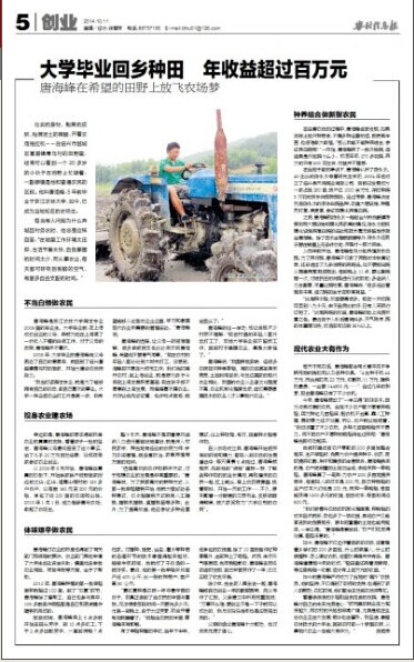 自从农场成立后,唐海峰开始把所有的时间和精力,都投入到农场的发展建设中:每天清晨5点刚过,唐海峰就起床,先到他的“领地”里转一转,了解各种作物的的生长情况,再和雇来的农民一起,扛上锄头、背上农药喷雾器、挑着肥料,开始一天的工作……不久,原本戴着一付眼镜的文弱书生,皮肤被晒得黝黑,被大家笑称为“大学级别的农民”。