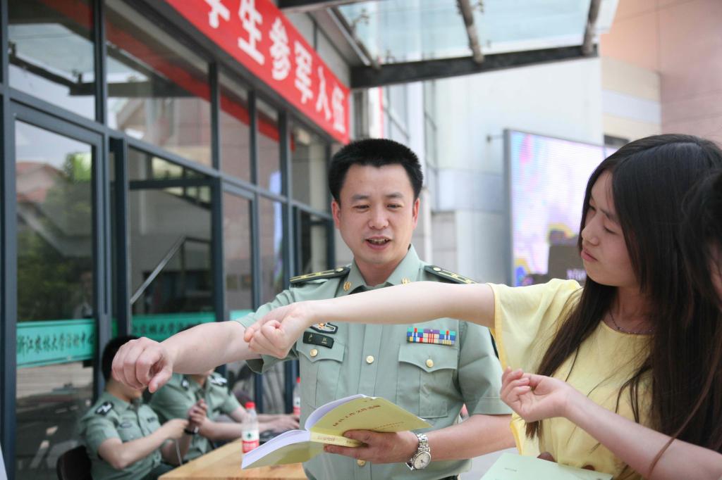 6月13日,浙江农林大学举行了在校大学生参军工作咨询活动,地方武装部门和相关军队还专门设置了政策咨询台为大学生解难释疑,吸引了近百名大学生报名和咨询。