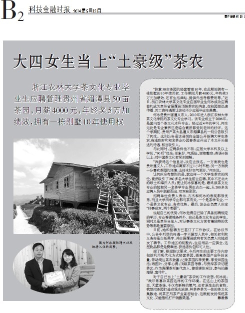 浙江农林大学茶文化专业毕业生应聘管理贵州省湄潭县50亩茶园,月薪4000元,年终奖5万加绩效,拥有一栋别墅10年使用权