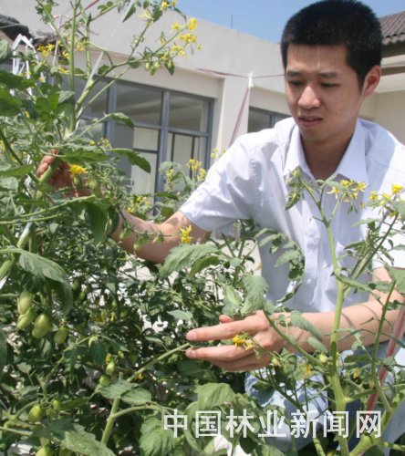 图为赵颖雷在学校15号学院楼屋顶查看使用“城市屋顶果蔬管道栽培”技术培育的多色番茄的生长情况。陈胜伟 摄