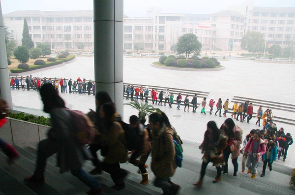 16日早上7点,浙江农林大学的学生排起了长龙步入图书馆,排队的学生早起排队希望能“秒杀”到图书馆里一个好座位。浙江农林大学图书馆现有1000多个座位,因为装有空调、学习环境较好,成了同学们期末复习最好的选择。 视野网供稿