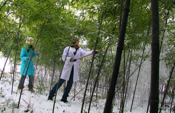 位于浙江农林大学校园内的国家林业局林木良种基地是我国重要的林木、竹类种质资源保存基地,收集了国内外珍稀竹种近300种,是集科研、教学、生产为一体的植物资源遗传基因库。为保护这些珍稀竹种,浙江农林大学专家们冒着暴风雪通过打雪和钩梢清理竹园。