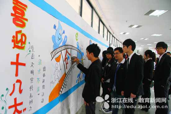 近日,浙江农林大学的“喜迎十八大”学生墙绘大赛活动正在火热进行。据悉,除了以墙绘的形式呈现改革发展成就外,学校还有不少创意活动,如新生笑脸迎十八大、徒步攀登天目山等,受到了师生的好评。而在浙江大学宁波理工学院,全校师生不仅通过微博表达对十八大的期待,还将十八大”的元素融入即将开幕的校园文化艺术节,如“喜迎十八大,争创新业绩”主题演讲比赛、红色设计优秀作品展、流动党课下寝室、十八大主题读书会等。