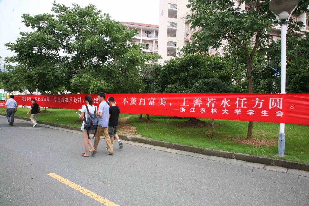 9月8日,浙江农林大学校园里一条横幅让很多新生眼前一亮,该横幅由浙江农林大学学生制作,内容是:阳光小伙,不求高富帅,厚德载物承经纬;精致姑娘,不羡白富美,上善若水任方圆。不少学生认为,该横幅内容大气,体现了当代学生的价值观。