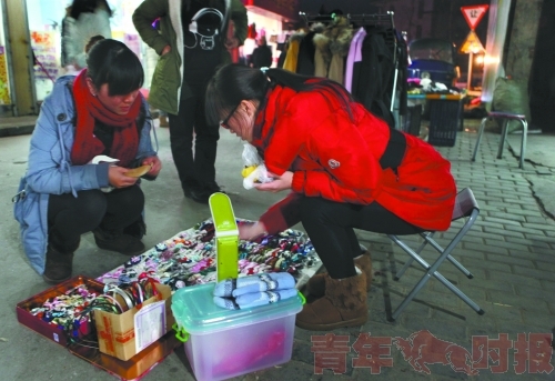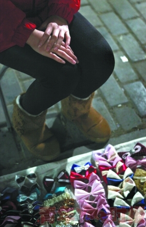 12月18日晚上,在校内的交易市场里,包小燕正在一个摊位前销售“蝴蝶结”:一块无纺布铺在地上,上面整齐地排列着紫色的、粉色的、奶白色的各种颜色的蝴蝶结头花和发夹。和交易市场内其他的学生商家不同,其他同学的各种物品都是市场上批发来的,而小燕销售的蝴蝶结头花、蝴蝶结发夹,则全部是自己亲手制作的。摊位前,一位当地的市民专程过来选购头花,小燕认真地帮助这位顾客挑选,并递上镜子让顾客自己试戴:“你的脸形非常适合这个粉色的蝴蝶结头花,而且这个款式属于韩版,你戴上看看,如果再戴上这个粉色的发夹就更好看了。”很快,这位顾客买好了自己喜欢的蝴蝶结头花。