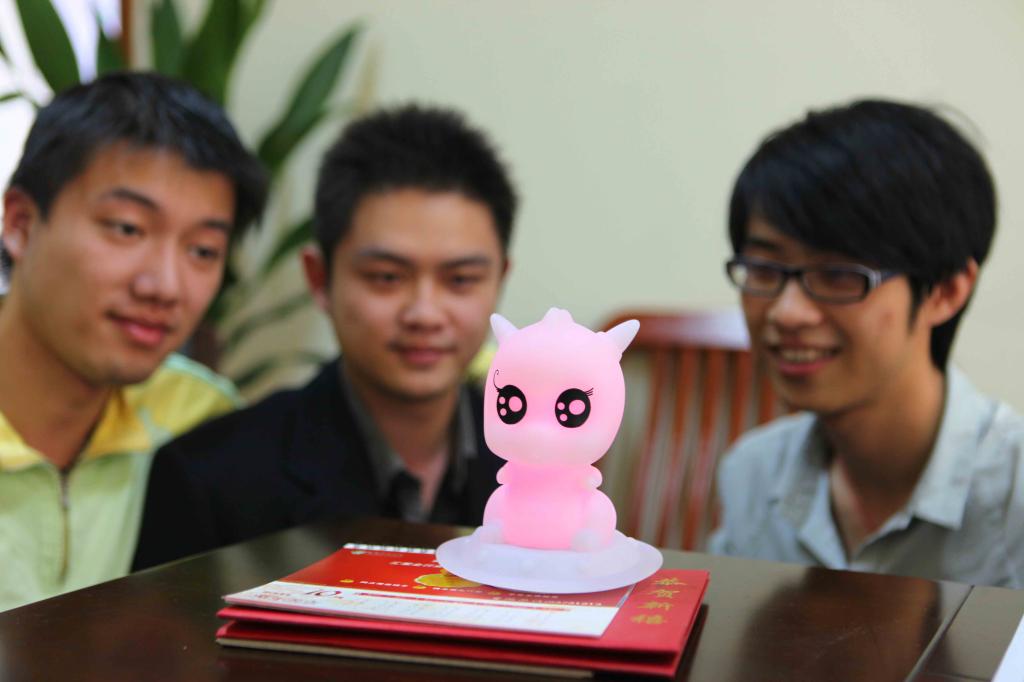 浙江农林大学机械设计专业赵东铬、林直如等5名同学,通过半年的设计研制,成功发明了能伴随环境颜色变化而同步变化的玩具“变色龙”,一投入市场就受到了欢迎。“变色龙”的玩具,放在什么颜色的物体上就会跟着发出什么颜色,然后通过程序调节玩具内部的光源色彩,最终达到和周围环境颜色一样的光,从而实现随环境同步变化颜色的效果。 http://jrzb.zjol.com.cn/html/2011-10/19/content_1140509.htm?div=0 《今日早报》:2011.10.19