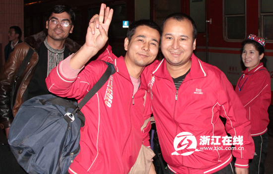 “第一次到浙江来,大家都很高兴。”小伙买买提江·吐尔地身穿统一的红色制服,提着行李走下3号车厢。