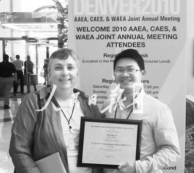 日前,从美国丹佛市传来消息:在刚刚结束的美国农业和应用经济学协会、加拿大农业经济学学会及西方农业经济学协会的联席会议上,来自加拿大阿尔伯塔大学的中国留学生雷海聪提交的论文脱颖而出,获得本次会议论文评选第一名。