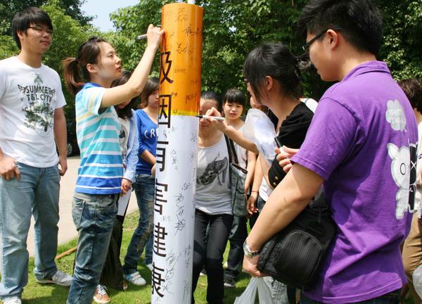 5月30日,浙江农林大学的学生制作了“巨型香烟”、“人体香烟”,通过签字支持抵制香烟等形式,倡导广大群众加入到拒绝香烟的队伍中来。今年5月31日是第23个“世界无烟日”,主题是“性别与烟草——抵制针对女性的市场营销”。 《浙江科技报》:2010.6.3