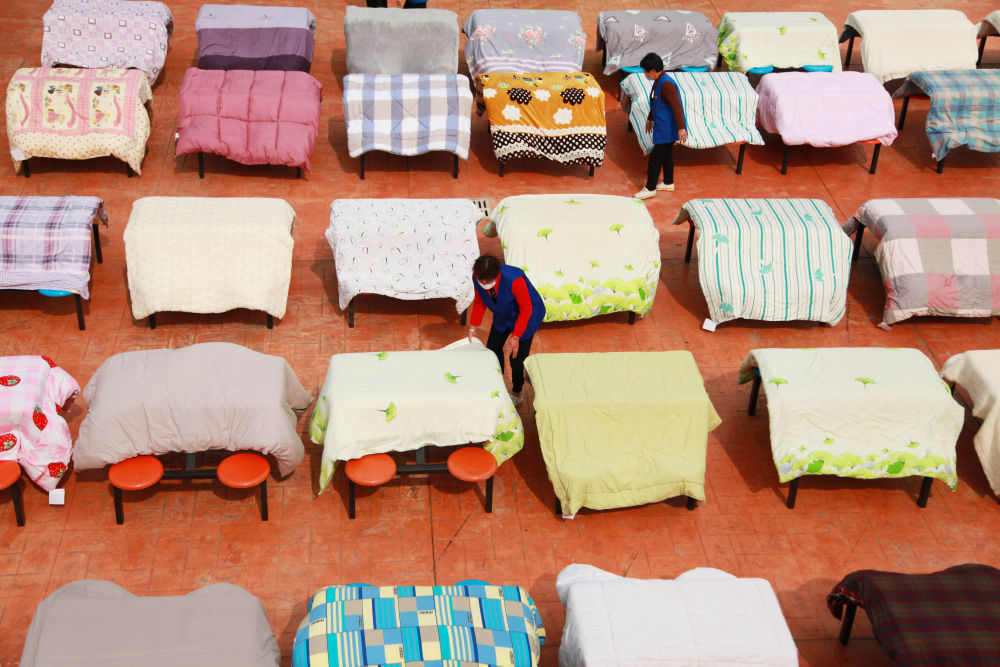 4月22日,浙江农林大学后勤集团的宿舍管理员在帮即将返校的学生们翻晒被子。(图片由浙江农林大学提供)