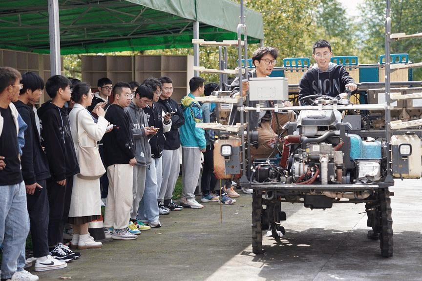 活动中,研究生向本科生们展示了插秧机、蓝莓采摘机、电动拖拉机等多种特色农用机具,并指导本科学生操控机器进行部分功能的演示和驾驶。一时间活动现场沸腾了起来,大家争先恐后想要试着控制这些“温顺的大家伙”。同学们都对器械上感兴趣的部分进行充分的学习和了解。