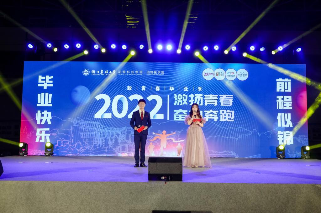 6月12日晚,动科动医学院“激扬青春·奋力奔跑”2022届毕业生主题晚会在东湖校区体育馆举行。校党委副书记施美红,校党委委员、宣传部部长倪建均,校特聘教授、动科动医学院名誉院长方维焕,校党委委员、动科动医学院院长宋厚辉,中国农业大学动物医学院原院长汪明,民建中央企业委员、清华大学经济管理学院名誉董事陈伟,杭州天元宠物用品股份有限公司总裁江灵兵、零库存科技发展有限公司董事长刘宗乐等领导、嘉宾和学院全体教师、2022届全体毕业生及家长代表共同参加了晚会。
