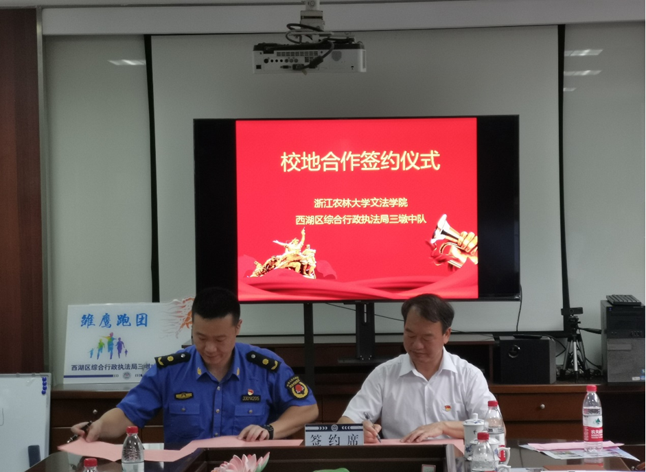 会上,朱红东书记介绍了文法学院基本概况、公共管理学科特色与教育成果,就双方加强合作提出建设性意见。三墩中队有关负责人介绍了中队基本情况,对双方深化合作提出具体设想。随后,双方签署《合作共建协议书》《党建共建协议书》,共同揭牌“浙江农林大学文法学院教学实践基地”,并互聘了指导教师、挂职干部。