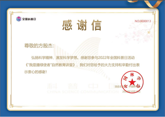 10月15日,校团委因组织师生积极参与2022年全国科普日活动《“我是播绿使者”自然教育讲堂》,收到中国林学会感谢信。