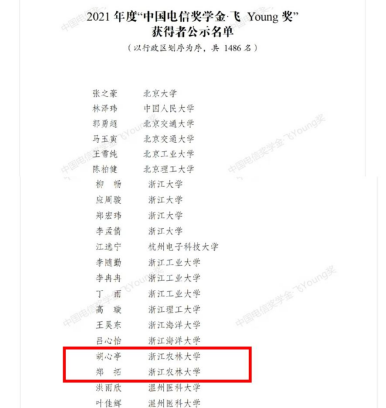 据悉,2021年度中国电信奖学金的遴选,是为推介一批凝聚和引领当代大学生树立远大理想、热爱伟大祖国、担当时代责任、勇于砥砺奋斗、练就过硬本领、锤炼品德修为的优秀大学生典型。2021年度“中国电信奖学金”分为“中国电信奖学金•天翼奖”“中国电信奖学金•飞Young奖”,经校级、地市级分别推荐,省级初评和全国评审,全国共确定“中国电信奖学金·天翼奖”获得者98名,“中国电信奖学金·飞Young奖”获得者1486名。