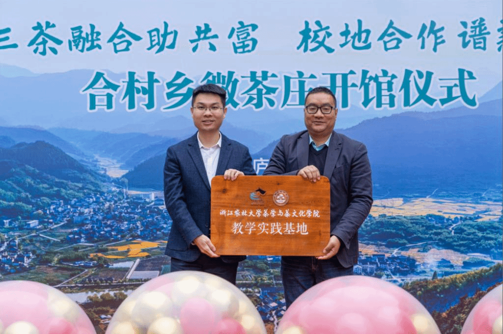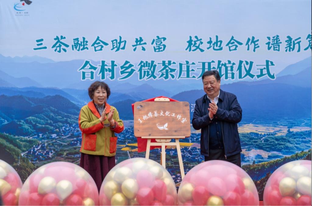 11月15日,茶学与茶文化学院与合村乡校地合作签字授牌暨微茶庄开馆仪式在桐庐合村乡瑶溪村举行。杭州市原副市长、茶文化研究会会长何关新,茶文化界泰斗姚国坤教授,茶学与茶文化学院名誉院长王旭烽教授,桐庐县政协、县委组织部、县农业农村局领导,茶学与茶文化学院班子成员、相关教师学生代表,合村乡班子成员、村干部代表、本地村民和茶农参加。