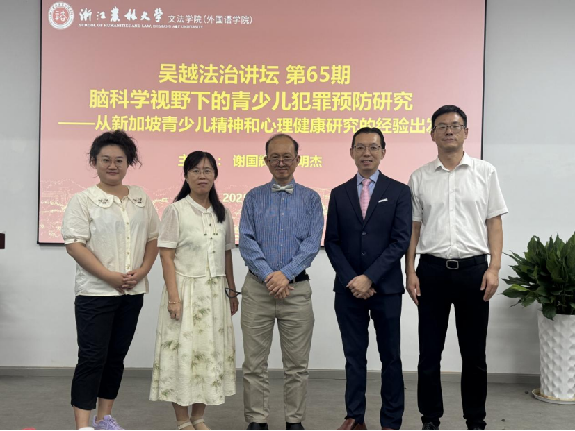 9月24日晚,浙江农林大学文法学院省级涉外法治人才培养基地海外专家讲座《脑科学视野下的青少儿犯罪预防研究》举办。基地特邀新加坡管理大学特聘专家、新加坡教育性治疗师公会邓明杰会长和亚洲知名高级教育性诊疗师、新加坡鱼尾狮青少儿诊疗中心首席诊疗师谢国辉教授进行英文讲座。讲座由涉外法治基地办公室主任姜少平博士主持,文法学院相关负责人、法学学科负责人、博士生代表和本硕学生共同参与。
