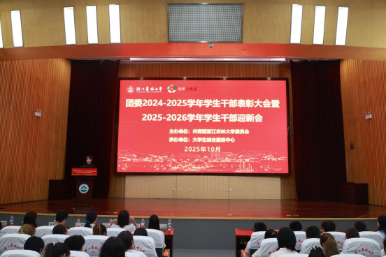10月11日晚,浙江农林大学团委2024-2025学年学生干部表彰大会暨2025-2026学年学生干部迎新会举行。校团委书记胡云云,团委各校级学生组织指导老师及团委学生干部代表500余人参会。