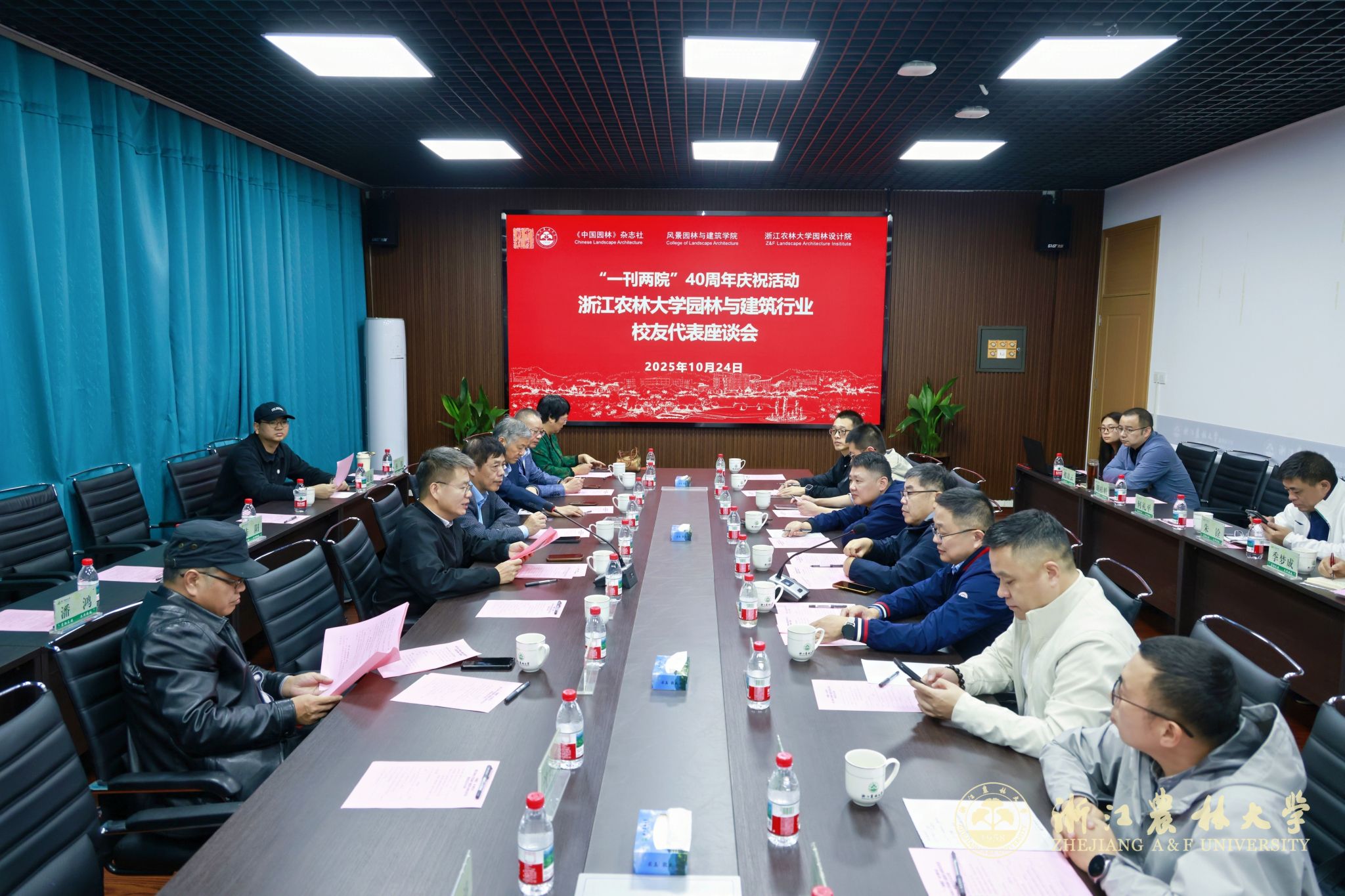 10月24日,值此《中国园林》杂志、风景园林与建筑学院、园林设计院(以下简称“一刊两院”)创立四十周年之际,浙江农林大学园林与建筑行业校友代表座谈会在园林设计院101会议室举办。本次座谈会以“凝聚校友力量,共绘发展蓝图”为主题,汇聚学院与设计院领导、优秀校友代表、荣休教师及教职工代表,共同回顾峥嵘岁月,展望未来征程。