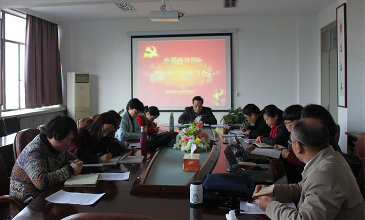 12月22日下午,外语学院在实验大楼召开理论中心组学习会,专题学习全国高校思想政治工作会议精神,研究部署贯彻落实工作。会议由外语学院党总支书记张敏生主持,学院党政领导班子成员及各支部书记参加了学习。
