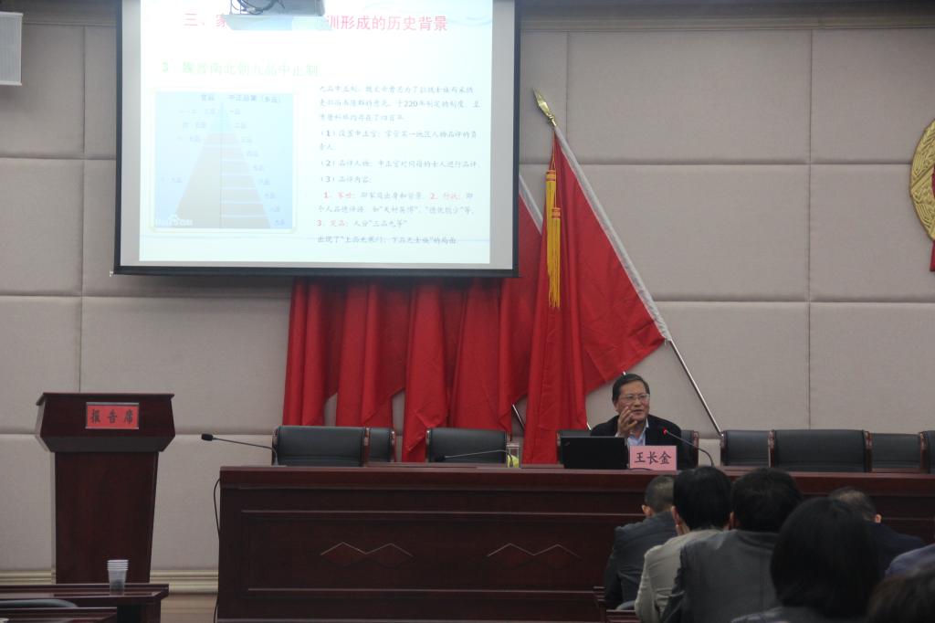 4月25日,马克思主义学院、法政学院院长王长金应邀为天目山镇作“树立优良家风重塑家庭文化”的专题报告,此次报告为天目山镇“道德讲堂•好家风”课堂第一讲,天目山镇近百位领导干部聆听讲座。
