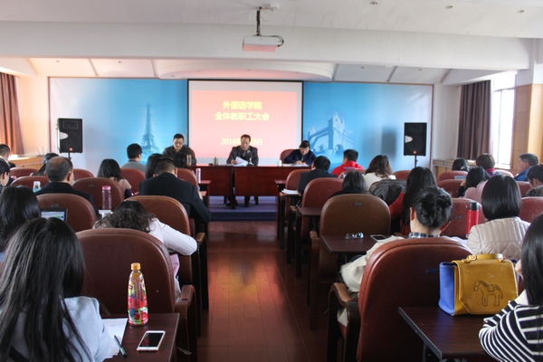 3月3日下午,外国语学院召开新学期全体教职工大会,贯彻学习学校中层干部扩大会议精神,部署2016年重点工作。