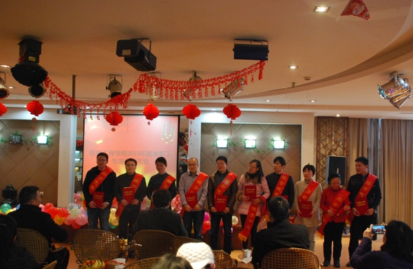 学院院长寿国忠致新年贺词,全面回顾了学院2015年度各方面取得的成绩,勉励全体教职工继续奋发向上,争取在新的一年取得更优异的成绩。学院党政领导依次为2015年度先进集体、综合先进个人、教学科研先进个人、优秀辅导员、优秀班主任、优秀党支部书记、工会先进工作者和积极分子颁发荣誉证书和佩戴绶带。