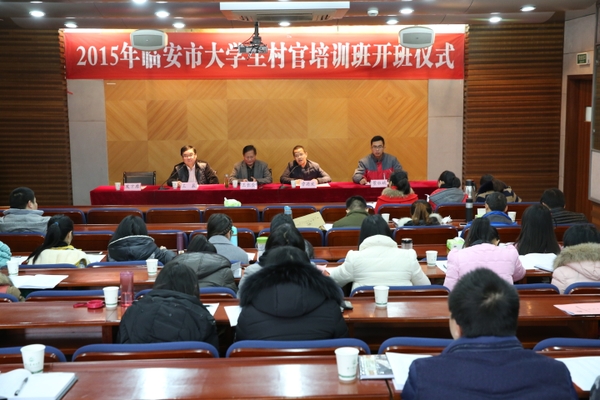 为切实加强大学生村官服务农村的履职能力,不断提高大学生村官的业务水平, 12月21日上午,2015年临安市大学生村官培训班在我校东湖校区正式开班。本次培训由临安市委组织部、临安市人力资源和社会保障局和村官学院联合举办。法政学院院长、村官学院常务副院长王长金,临安市委组织部部务会议成员、副局级组织员曹源发,以及学工部、校团委相关负责人和53名临安市大学生村官代表参加了开班仪式。