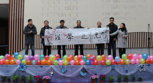 在航模协会指导老师的操控下,一架载有“理学之光”卷轴的四旋翼飞行器模型缓缓升起,吸引了全场的注意,将开幕式的气氛推向高潮。最后,到场嘉宾一齐展开卷轴,“理学之光”几个大字跃然而出,标志着理学院第九届科技文化节系列活动的正式开幕。