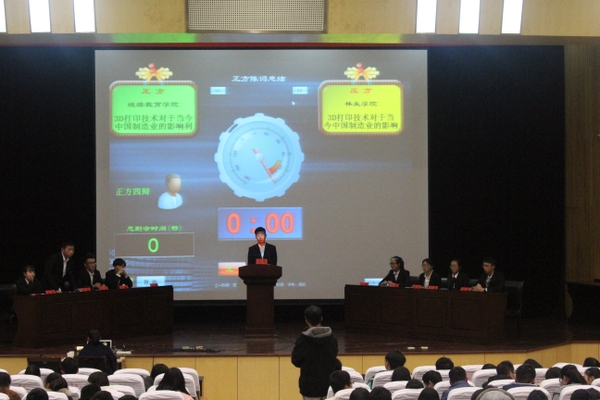 决赛分为两场,第一场为季军争夺赛,以“大学生信用消费应不应该被鼓励”为辩题,正方农学院辩论队举出生活中鲜明真实的例子打造锋利的事实矛。反方暨阳学院辩论队,激烈反驳“这是一种用今天的诚信换取明天的金钱的行为,并不可取”加固己方的真理盾。第二场为冠军争夺赛,正方继教学院与反方林生院狭路相逢,在辩题“3D打印技术对于当今中国制造业的影响到底是利大于弊还是弊大于利”中,双方辩手就本方的观点进行了激烈地观点阐述。